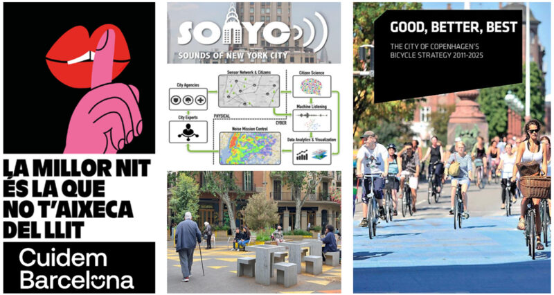 Barcelona, a través de su programa de “Supermanzanas”, reorganiza el tránsito vehicular para priorizar la movilidad peatonal, reduciendo la contaminación acústica en el espacio público y fomentando la convivencia barrial. En esa misma línea, la campaña “Convivència 2023” impulsa la empatía y el respeto mutuo, mediante mensajes que invitan a cuidar los espacios públicos y disfrutar la ciudad con responsabilidad. De modo similar, en Ámsterdam la iniciativa “I Live Here” con el lema “Vivo aquí, disfrútalo como lo harías en tu propio barrio”, apela a la conciencia ciudadana y al respeto cotidiano por el entorno, recordando que la convivencia urbana se construye desde el conocimiento del otro y el uso compartido del espacio. Copenhague, a partir de su “Estrategia de Ciclo Movilidad 2025”, demuestra cómo la movilidad activa puede convertirse en una política efectiva de reducción del ruido y mejora ambiental. Y, por último, en Nueva York, el proyecto “Sounds of New York City (SONYC)” combina sensores acústicos y participación ciudadana para identificar fuentes emisoras en tiempo real y fortalecer la gestión pública.